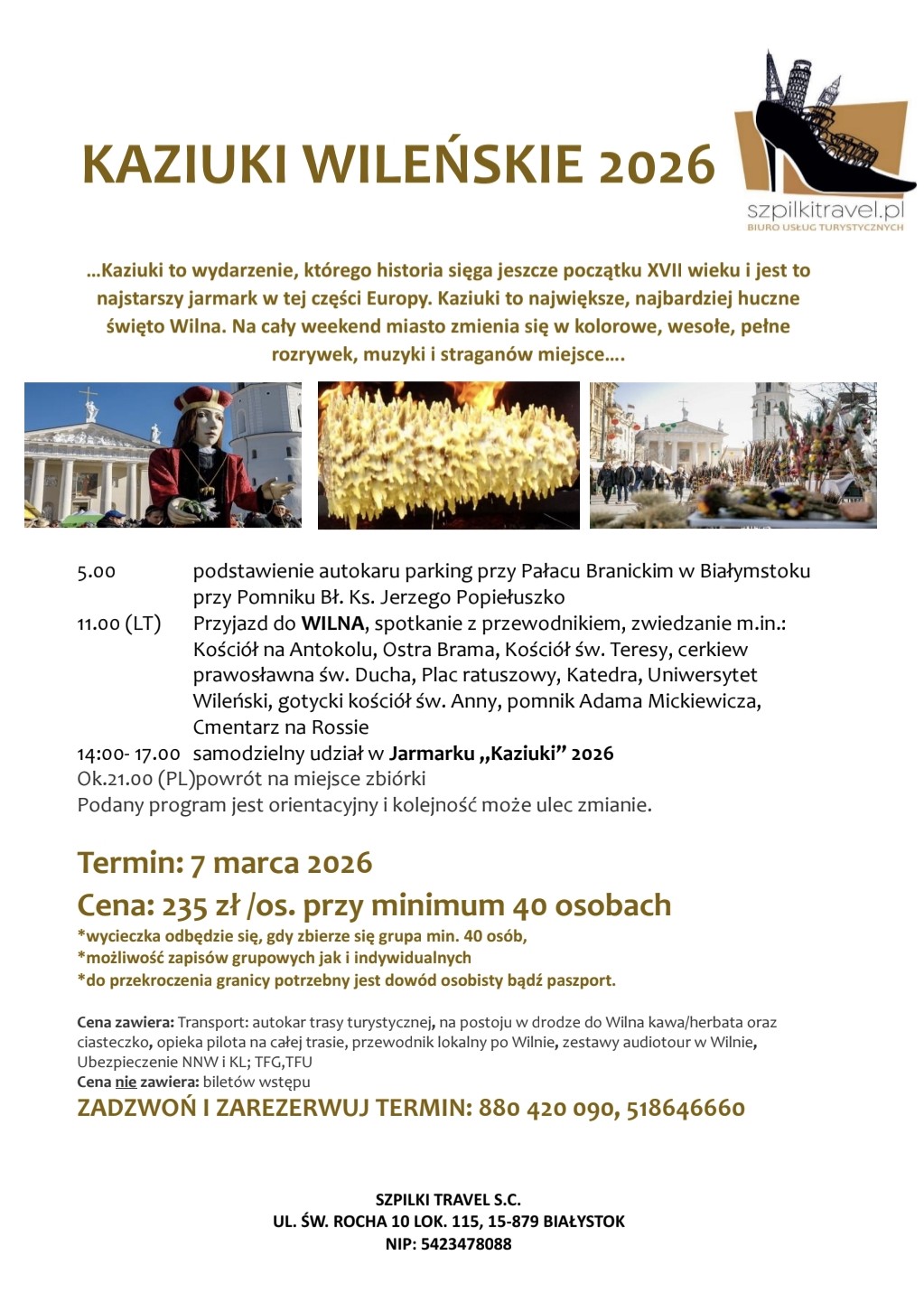 - jeżeli nazbiera się grupa 35-40 uczestników odjazd autokaru sprzed Aresztu Śledczego w Białymstoku, jeżeli nie - wyjazd zgodnie z ofertą biura podróży;